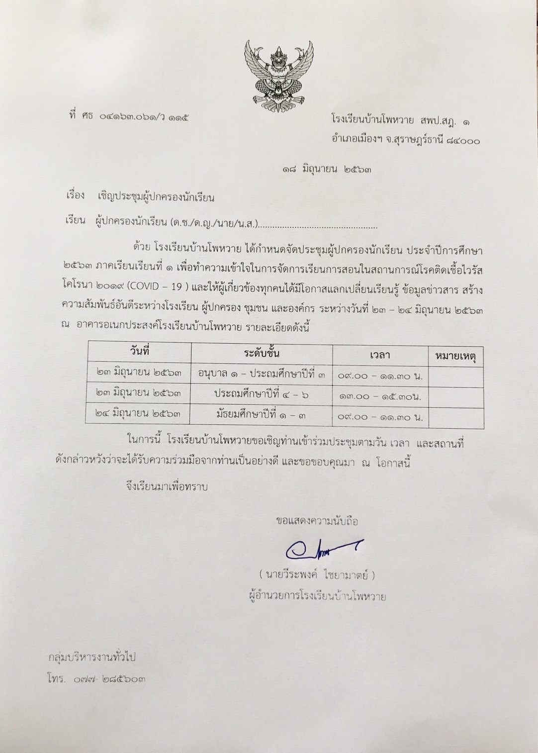 เปิดการจัดการเรียนการสอน ประจำภาคเรียนที่ 1 ปีการศึกษา 2563 รูปแบบการจัดการเรียนรู้ในช่วงการแพร่ระบาดของเชื้อไวรัสโคโรนา 2019 (COVID-19) ทางโรงเรียนบ้านโพหวายต้องขอความร่วมมือกับผู้ปกครองให้ดำเนินการดูแลบุตรหลานของท่านตามมาตรการต่าง ๆ ที่โรงเรียนได้ดำเนินการชี้แจงให้ท่านทราบแล้วในวันประชุมผู้ปกครอง
