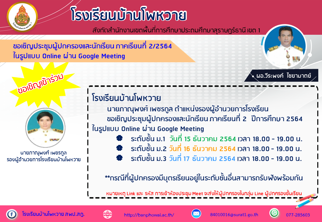 ขอเชิญผู้ปกครองระดับชั้นมัธยมศึกษาเข้าร่วมประชุม Online ผ่าน Google Meeting ตามวันเวลาที่กำหนด โรงเรียนบ้านโพหวาย นายภาณุพงศ์ เพชรกูล ตำแหน่งรองผู้อำนวยการโรงเรียน ขอเชิญประชุมผู้ปกครองและนักเรียน ภาคเรียนที่ 2 ปีการศึกษา 2564 ในรูปแบบ Online ผ่าน Google Meeting ระดับชั้น ม.1 วันที่ 15 ธันวาคม 2564 เวลา 18.00 - 19.00 น. ระดับชั้น ม.2 วันที่ 16 ธันวาคม 2564 เวลา 18.00 - 19.00 น. ระดับชั้น ม.3 วันที่ 17 ธันวาคม 2564 เวลา 18.00 - 19.00 น. **กรณีที่ผู้ปกครองมีบุตรเรียนอยู่ในระดับชั้นอื่นสามารถรับฟังพร้อมกัน หมายเหตุ Link และ รหัส การเข้าห้องประชุม Meet จะส่งให้ผู้ปกครองในกลุ่ม Line ผู้ปกครองชั้นเรียน